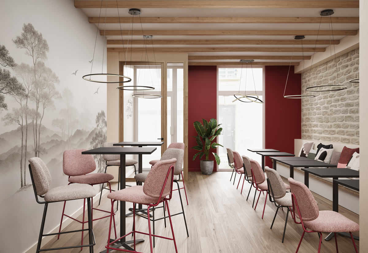 Malgré sa finesse apparente, le châssis repose sur des tubes d'une épaisseur de 1,8 mm pour un diamètre de 16 mm. Cette conception garantit une stabilité et une durabilité exceptionnelles, même pour un usage intensif quotidien. L'assise et le dossier sont garnis d'un tissu PUENTE de haute qualité. Ce textile, reconnu pour sa trame élégante et sa résistance, offre un accueil moelleux et un maintien ergonomique idéal pour des moments de détente prolongés. La structure bénéficie d'une peinture époxy qui protège efficacement l'acier contre les rayures et les chocs, tout en offrant une finition mate très soignée. Le repose-pied intégré à la structure assure une posture détendue, tandis que le dossier incurvé épouse parfaitement la forme du dos. Grâce à son piètement élancé, ce tabouret permet une grande fluidité de mouvement autour des comptoirs et îlots, facilitant le travail de vos équipes en salle.