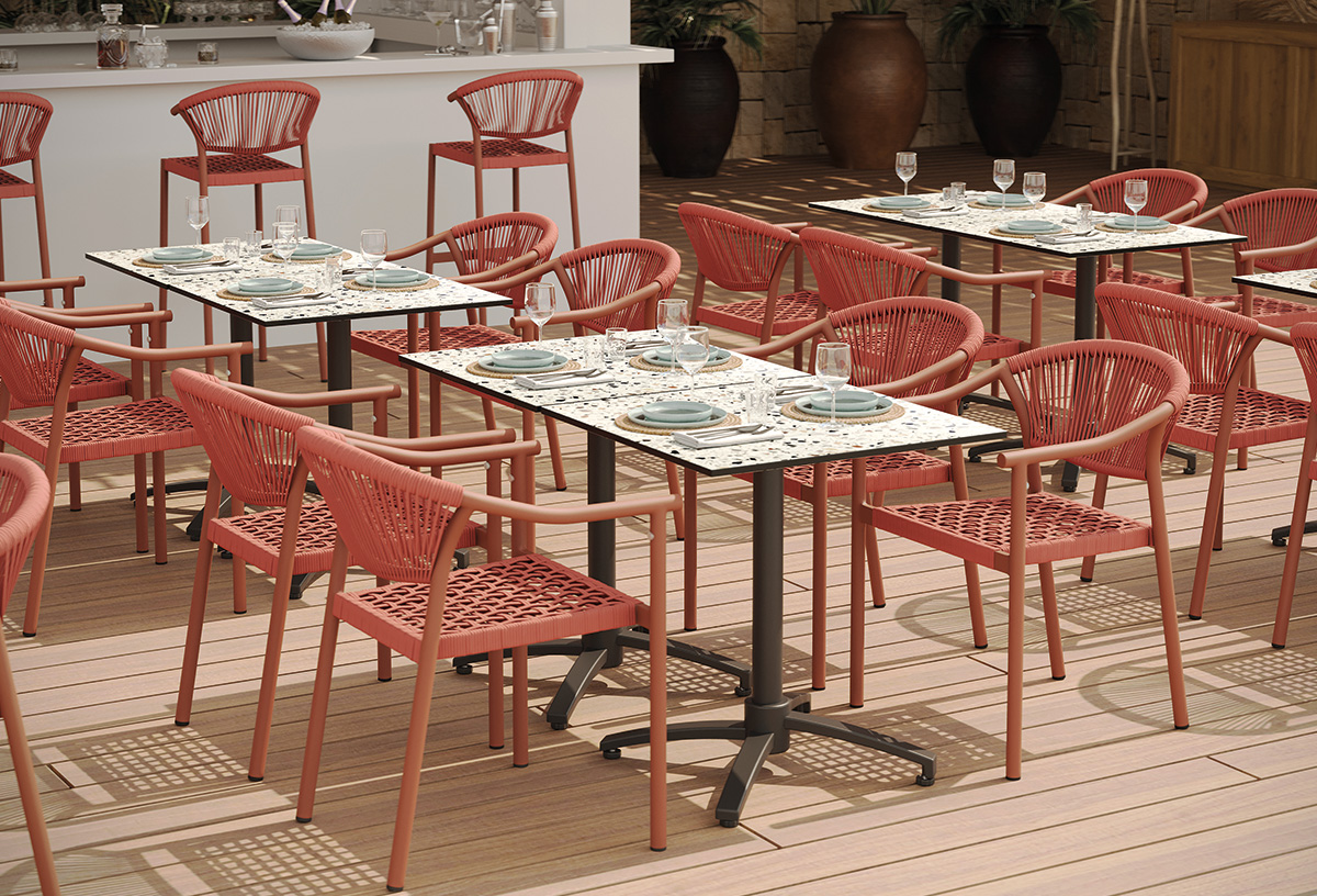 Avec ça structure en aluminium et son tressage effet corde, ce tabouret séduit par son design contemporain et naturel. Sa structure lui assure légèreté, solidité et résistance aux intempéries, idéale pour un usage professionnel en terrasse ou en jardin. Alliant élégance et fonctionnalité, il s’intègre parfaitement dans les espaces de restauration modernes ou d’inspiration méditerranéenne.