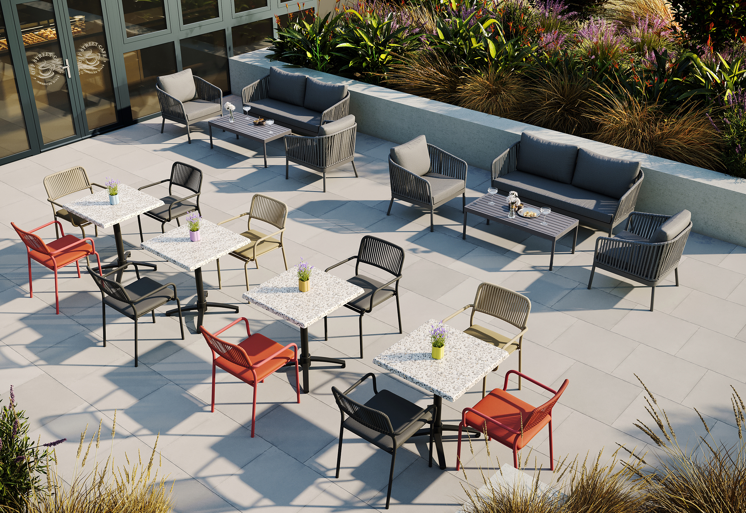 Le motif Malaga apporte une texture visuelle riche qui habille instantanément une salle tout en restant extrêmement facile à associer avec des piétements colorés ou en métal brossé.